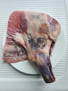Here at Fferm Wernlwyd / Grey Alders Farm, we hang our beef for fifty-six days. However, mutton is a smaller carcase and loses more moisture, so you will expect a shorter time-frame. All the same, we aim to dry age our mutton for thirty-five days on the bone in the chiller before cutting-up.